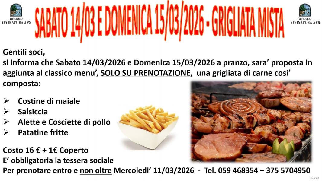 Gentili soci, nella locandina allegata, siamo a comunicare un MENU SPECIALE A PRANZO, in aggiunta a quelli classici, nelle giornate di Sabato 14/03/2026 e Domenica 15/03/2026.