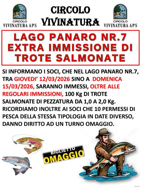 siamo a comunicare che da Giovedi' 12/03/2026 sino a Domenica 15/03/2026 nel Lago Panaro Nr.7 saranno immessi complessivamente in aggiunta alle regolari immissioni, 100 Kg di Trote Salmonate.